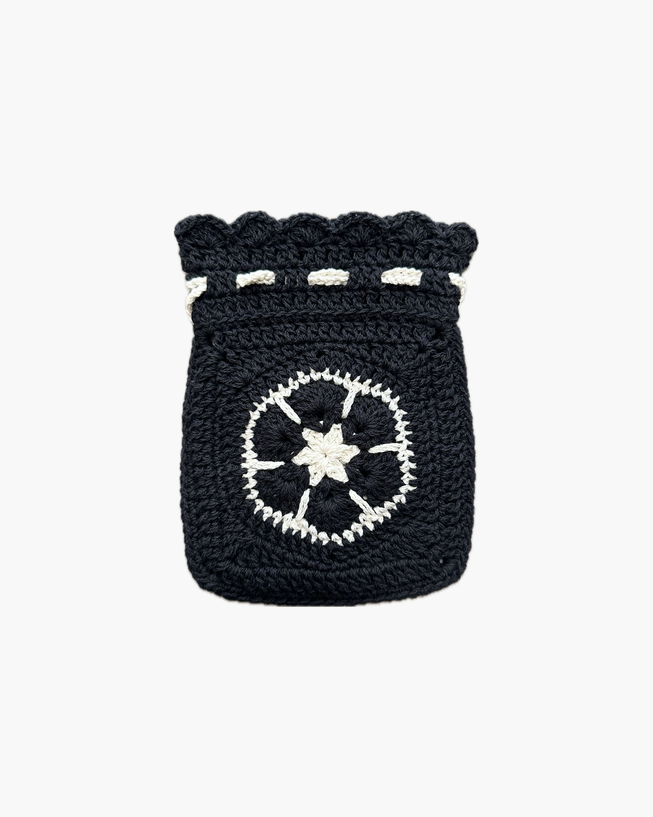 UNISEX Colour:Black Front fabric : 綿 100% アフリカンフラワー柄 モチーフの手編み巾着 たて 17.5cm よこ 13.5cm ※ 在庫あり|即日発送